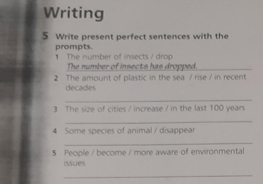 5 Write present perfect sentences with the prompts. 1 The number of insects / drop The number of insects has dropped. 2 The amount of plastic in the sea / rise / in recent decades 3 The size of cities / increase / in the last 100 years 4 Some species of animal / disappear 5 People / become / more aware of environmental issues