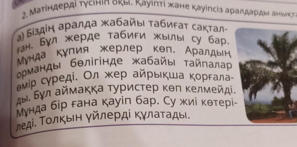 күн Мәтіндерді түсініп оқы. Қауіпті және қауіпсіз аралдарды анықта. 2. ық, ған. Бұл жерде табиғи жылы су бар. а) Біздің аралда жабайы табиғат сақтал- Мұнда құпия жерлер көп. Аралдың орманды бөлігінде жабайы тайпалар өмір сүреді. Ол жер айрықша қорғала- ды. Бұл аймаққа туристер көп келмейді. Мұнда бір ғана қауіп бар. Су жиі көтері- леді. Толқын үйлерді құлатады. ПОМОГИТЕ СРОЧНО НУЖНО НАДО ПОДЧЕРКНУТЬ ГЛАГОЛЫ