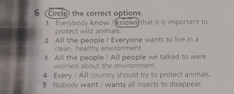 6 Circle the correct options. 1 Everybody know /knows that it is important to protect wild animals. 2 All the people / Everyone wants to live in a clean, healthy environment. 3 All the people / All people we talked to were worried about the environment. 4 Every / All country should try to protect animals. 5 Nobody want/wants all insects to disappear.