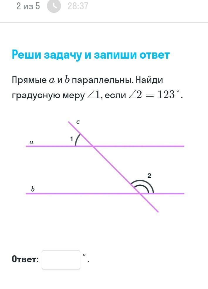 57°, чего тут думать? легко же, написано, что 123° это второй угол. Сумма прямых параллельных прямых равна 180°. Если известен один из углов, то берёшь и отнимаешь от 180°. Так получаешь ответ