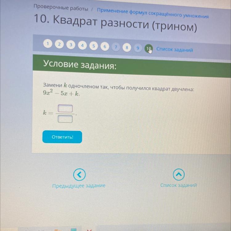 замени k одночленом так, чтобы получился квадрат двучлена: 9x во 2 степени -5х+k