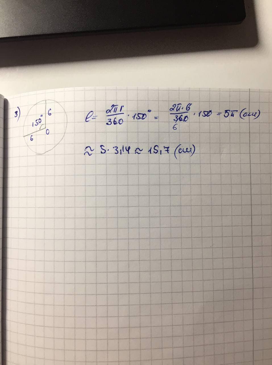 3)Радиус окружности равен 6 см, а градусная мера дуги равна 150°. Найдите длину этой дуги.