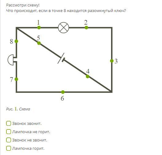 Если в точке 8 расположен разомкнутый ключ, то цепь звонка разорвана, а лампочки нет.