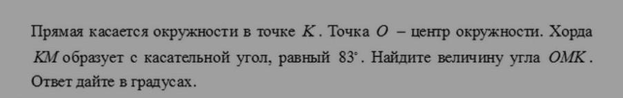 OK перпендикулярен к касательной. Соответственно, <OKM+83*=90*