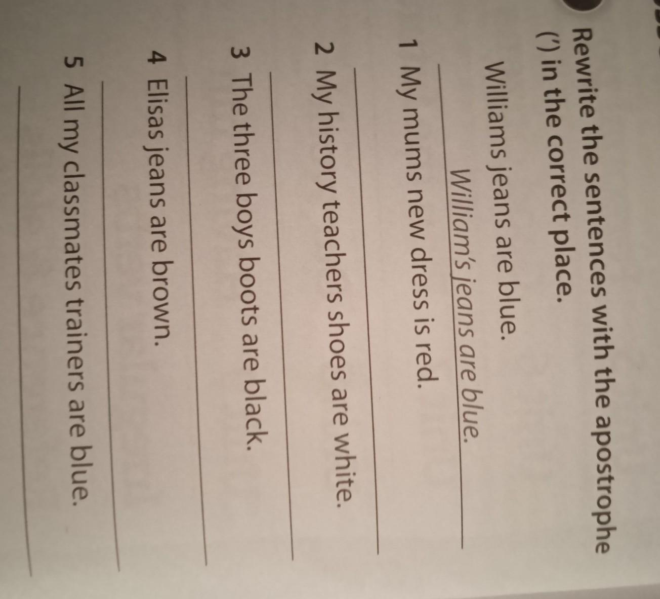 Ответ: 1)My mum's new dress is red. 2)My history teacher's shoes are white. 3)The three boy's boots are black. 4)Elisa's jeans are brown. 5)All my classmate's trainers are blue.