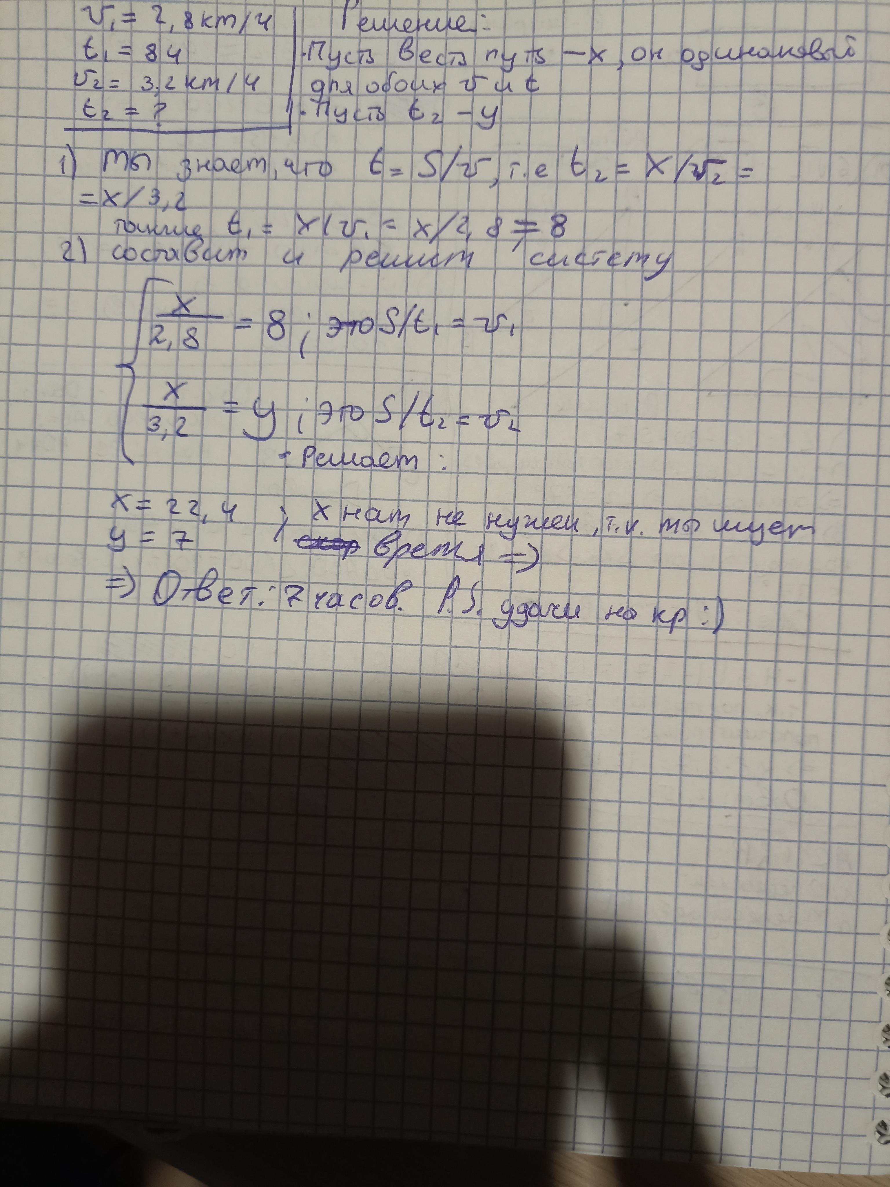 Если турист будет идти со средней скоростью 2.8 км/ч, он пройдет маршрут за 8 часов.Сколько часов будет длиться его поход при скорости 3.2 км/ч?