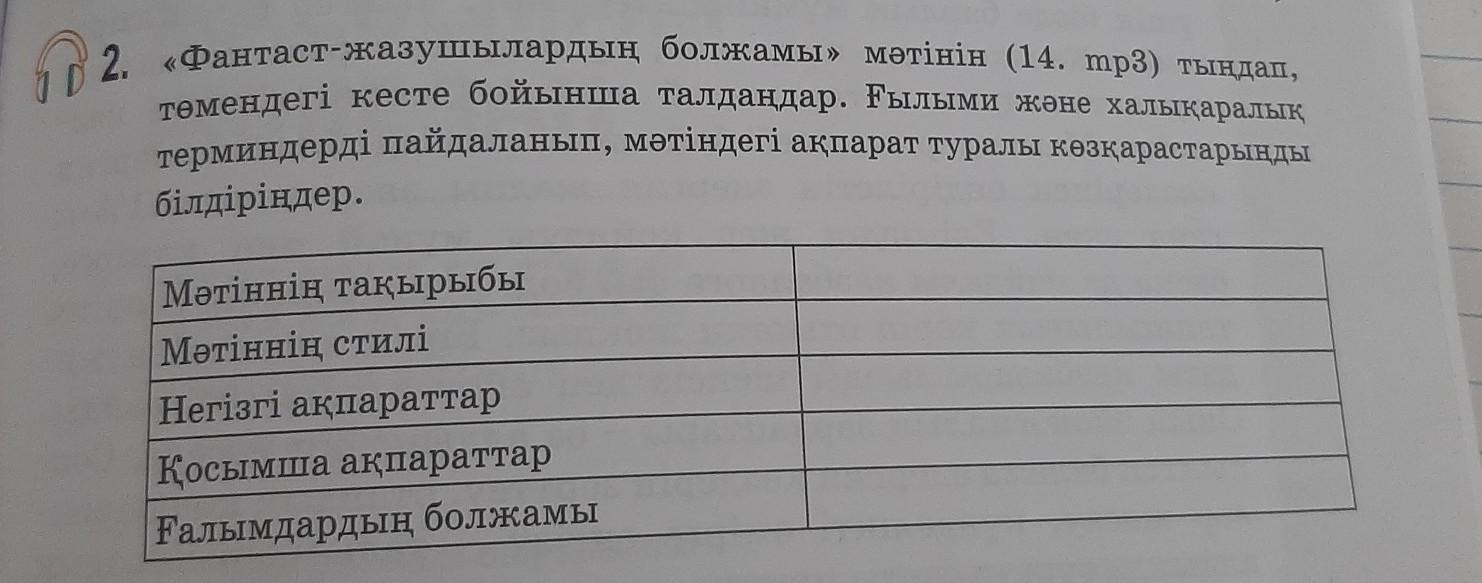 2 «Фантаст-жазушылардың болжамы» мәтінін (14, mp3) тындап, төмендегі кесте бойынша талдаңдар. Ғылыми және халықаралық терминдерді пайдаланып, мәтіндегі ақпарат туралы көзқарастарыңды білдіріңдер. Мәтіннің тақырыбы Мәтіннің стилі Негізгі ақпараттар Қосымша ақпараттар Ғалымдардың болжамы