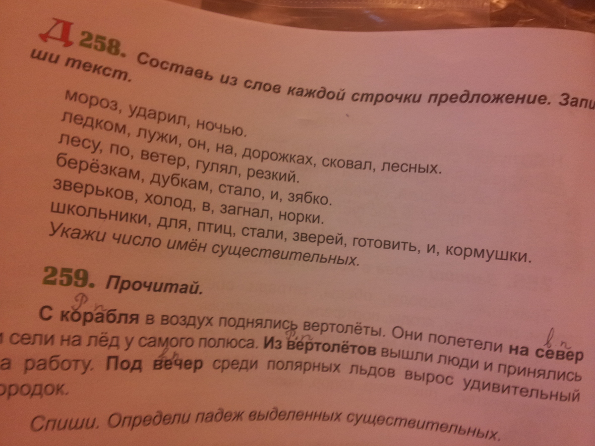 Ночью ударил мороз. Он сковал лужи на лесных дорожках. По лесу гулял резкий ветер.Березкам и дубкам стало зябко. Холод загнал зверьков в норки. Школьники стали готовить кормушки для птиц и зверей.