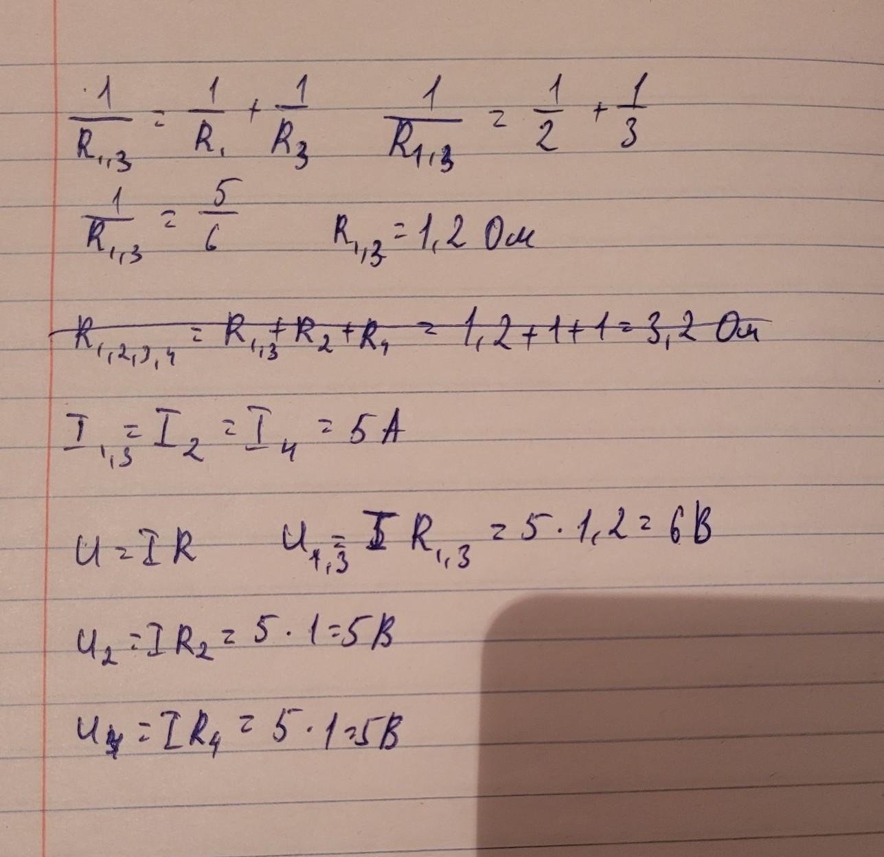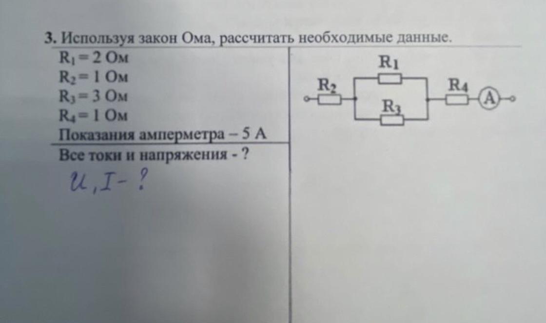 Используя закона Ома ,рассчитать необходимые данные.R1=2 Oм ,R2=1 Oм,R3=3Oм,R4=1 Oм. Показания амперметра -5 А. все токи и напряжения-?
