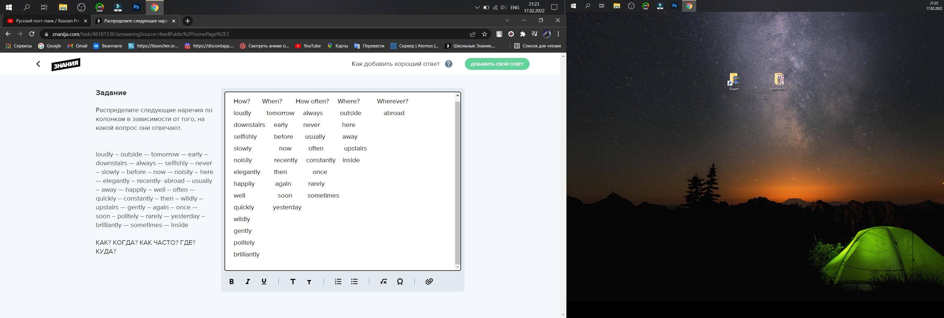 Распределите следующие наречия по колонкам в зависимости от того, на какой вопрос они отвечают.