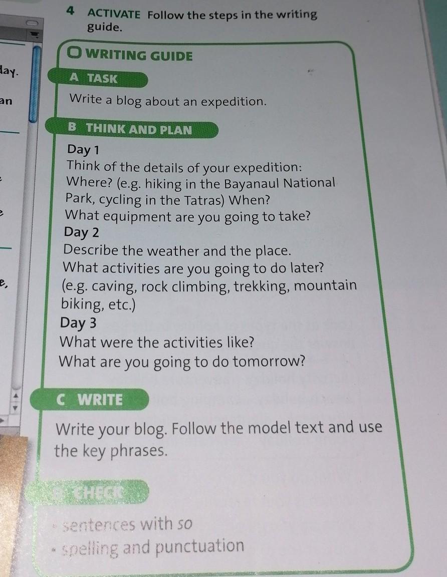 A ТASK Write a blog about an expedition B THINK AND PLAN Day 1 Think of the details of your expedition: Where? (eg, hiking in the Bayanaul National Park, cycling in the Tatras) When? What equipment are you going to take? Day 2 Describe the weather and the place. What activities are you going to do later? (e.g. caving, rock climbing, trekking, mountain biking, etc.) Day 3 What were the activities like? What are you going to do tomorrow?