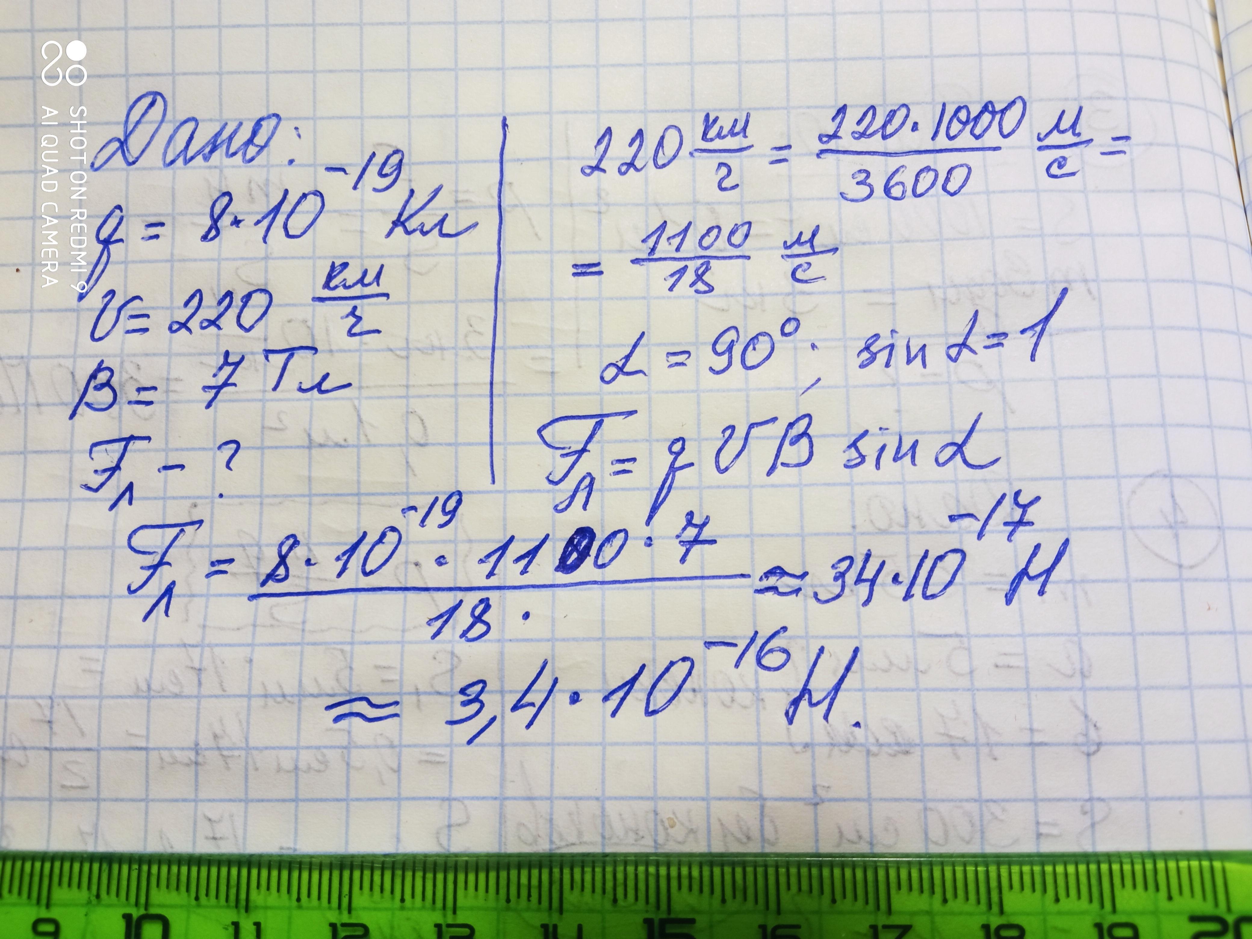 Частица с электрическим зарядом 8·10-19 Кл движется со скоростью 220 км/ч в магнитном поле с индукцией 7 Тл. Определить значение силы Лоренца