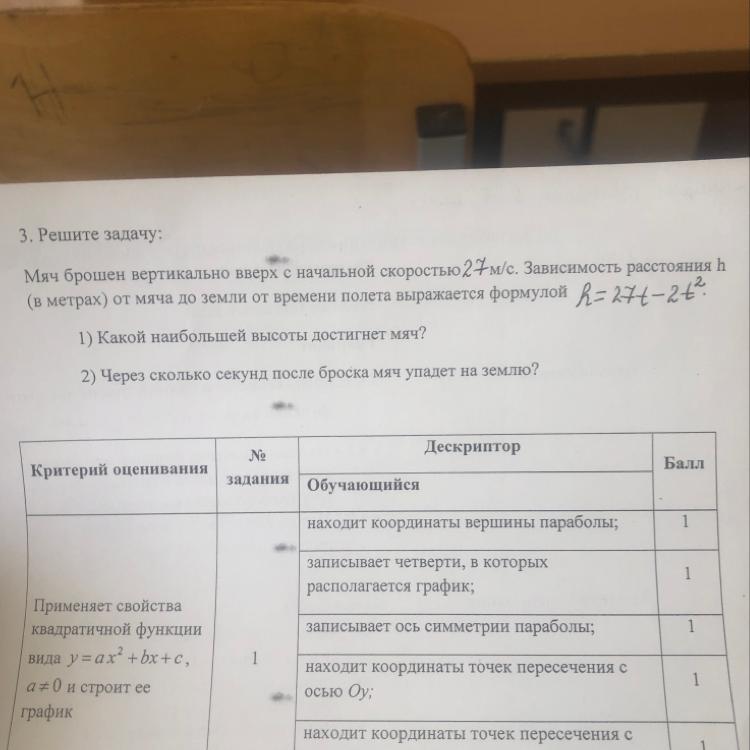(в метрах) от мяча до земли от времени полета выражается формулой h= 27t-2t^2