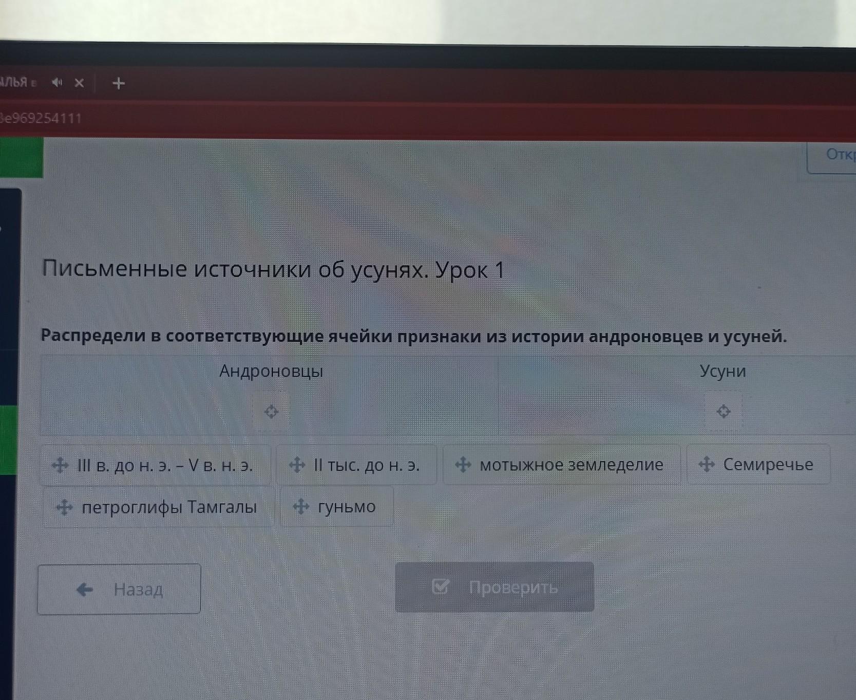 Распредели в соответствующие ячейки признаки из истории андроновцев и усуней. Андроновцы Усуни н II в. до н. э. — V в. н. э. II тыс. до н. э. и мотыжное земледелие в Семиречье петроглифы Тамгалы Гуньмо