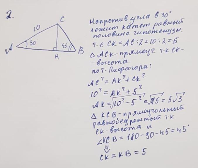В треугольнике АВС известно, что угол А=30°, угол В=45°, СК-высота, АС=10см. Найти отрезок ВК.
