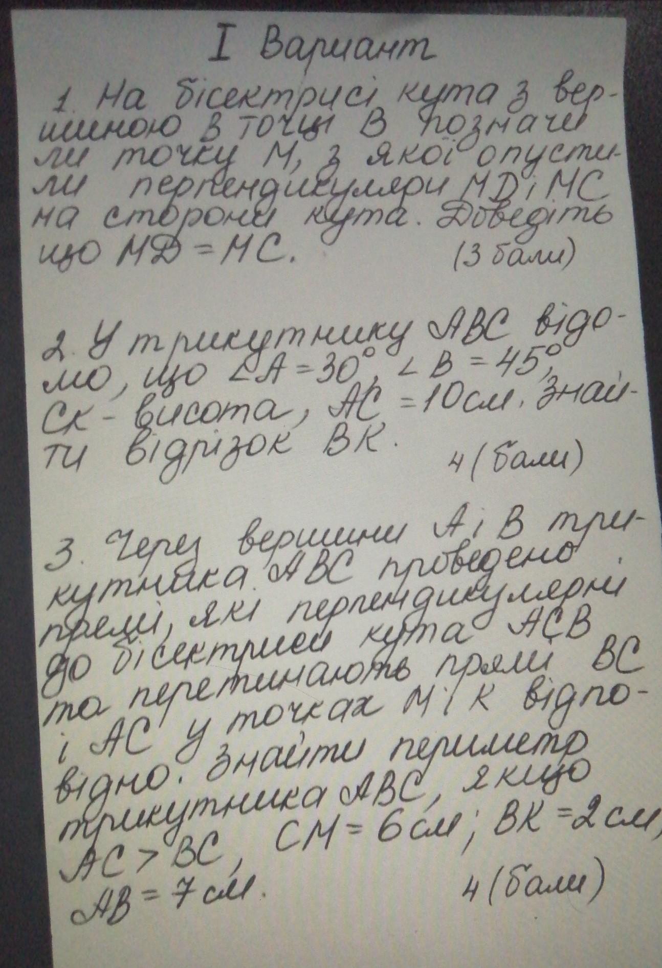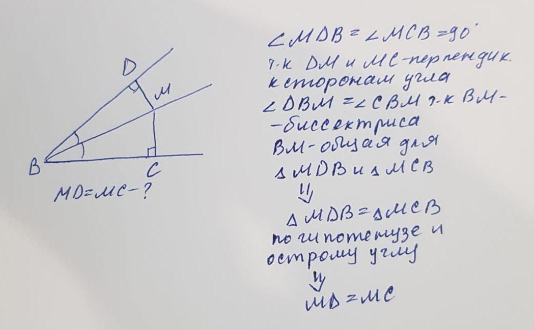 На биссектрисе угла с вершиной В точке В обозначили точку М, из которой опустили пендекуляры МД и МС на стороны угла. Докажите что МД=МС.