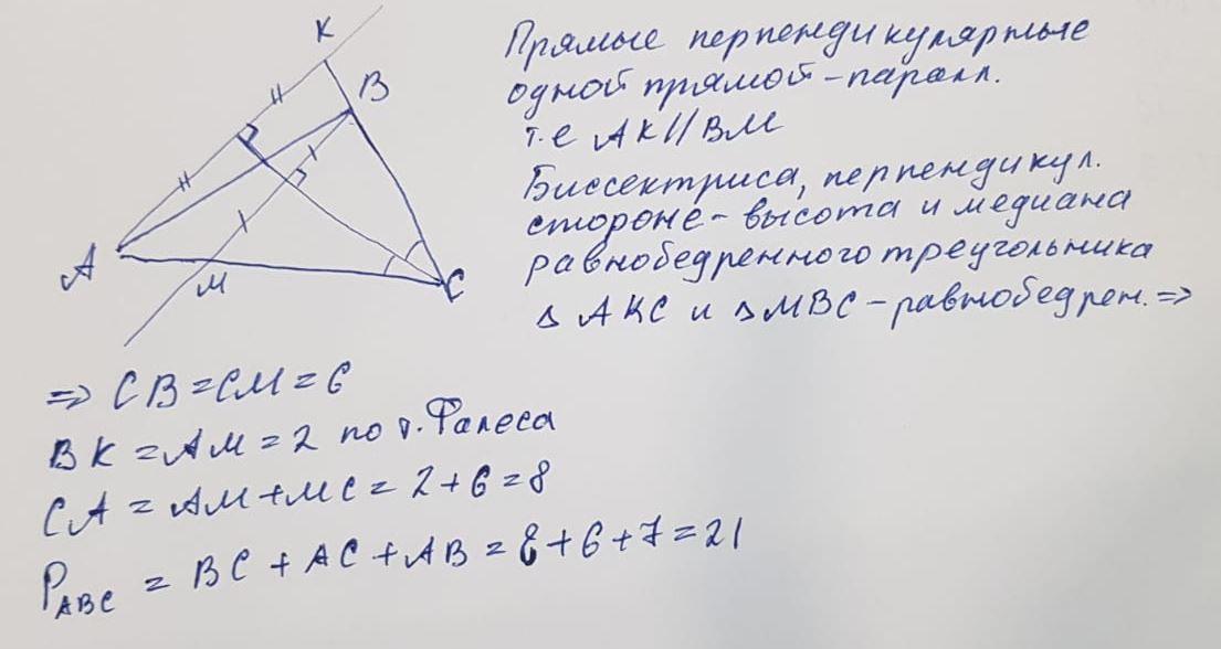 Через вершины А и В треугольника АВС проведены прямые, перпендикулярные биссектрисе угла АСВ и пересекающие прямые ВС и АС в точках М и К соответственно. Найти периметр треугольника АВС если АС>ВС,СМ=6см;ВК=2 см,АВ=7см