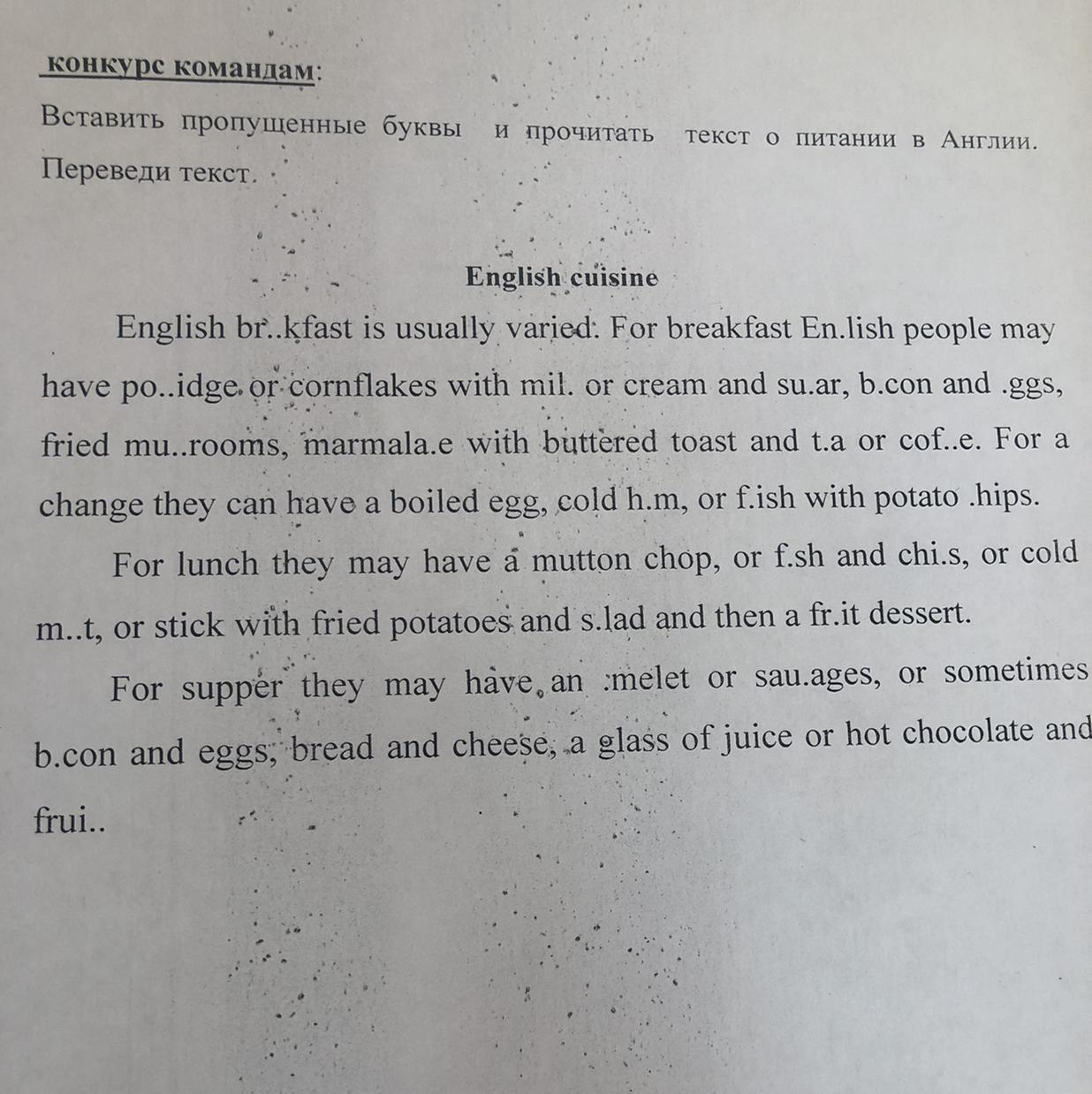 Английская кухня Английский завтрак обычно разнообразен: На завтрак англичане могут есть кашу или кукурузные хлопья с мил. или сливки и су.ар, бекон и .ggs, жареные му..комнаты, мармелад с тостами с маслом и т.а или кофе. Для разнообразия они могут съесть вареное яйцо, холодное мясо или рыбу с картофельными бедрами. На обед у них может быть отбивная из баранины, или рыба и чи, или холодная говядина, или палочка с жареным картофелем и салатом, а затем фруктовый десерт. На ужин у них может быть меле или сосиски, а иногда бекон и яйца, хлеб и сыр, стакан сока или горячего шоколада и фрукты.