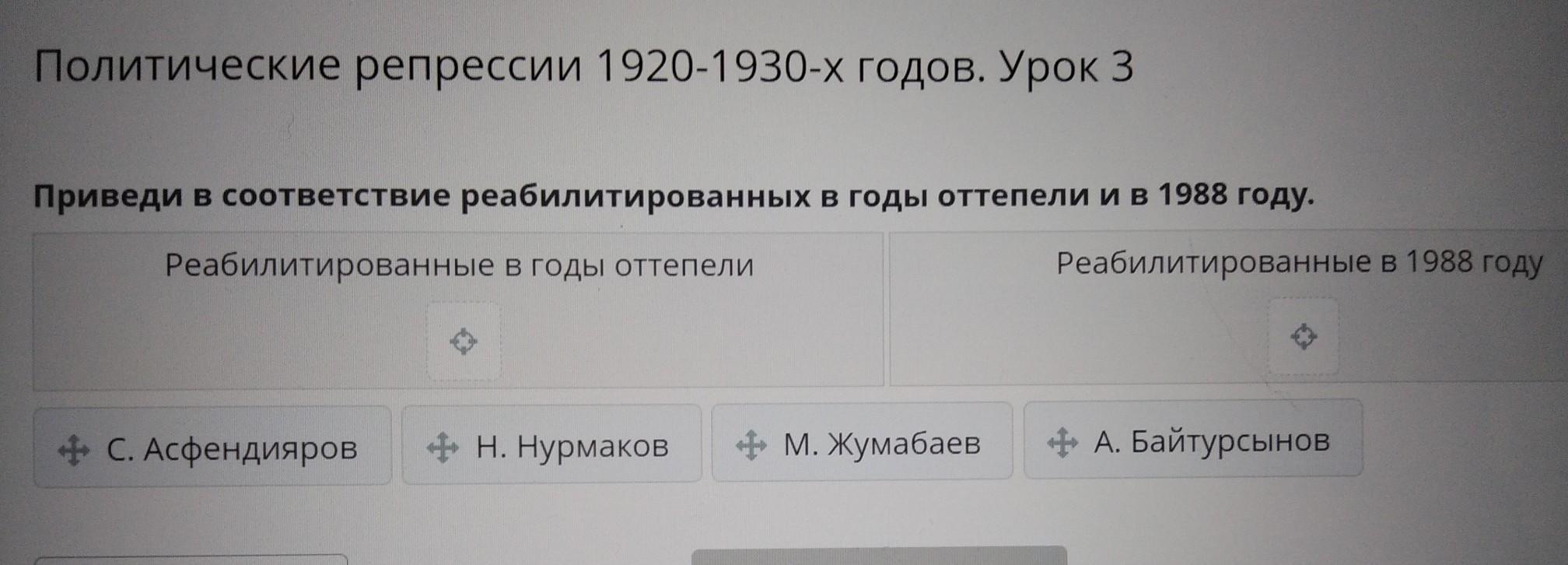 Приведи в соответствие реабилитированных в годы оттепели и в 1988 году. Реабилитированные в годы оттепели Реабилитированные в 1988 году + С. Асфендияров Н. Нурмаков + М. Жумабаев + А. Байтурсынов