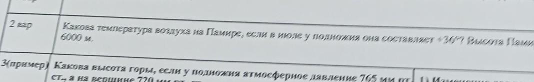 Через каждый километр температура падает на 6°. Значит 6 × 6 = 36. на это значение изменится температура. 36 - 36 = 0°. Ответ: на вершине Памира t°=0.