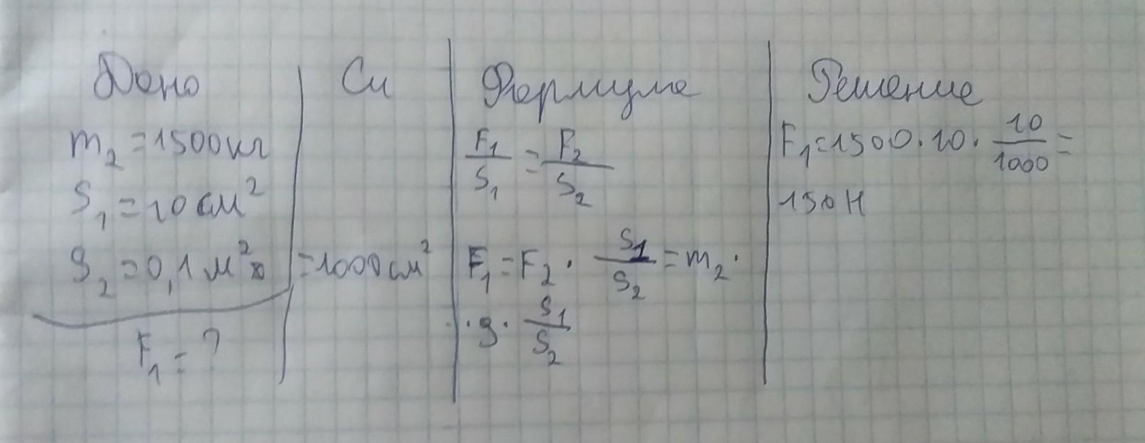 F1=F2*S1/S2=m2*g*S1/S2=1500*10*10/1000=150Н