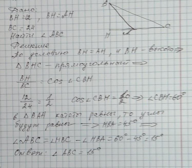 В ΔABH BH=AH⇒∠HBA=∠HAB=(180-90)/2=45°