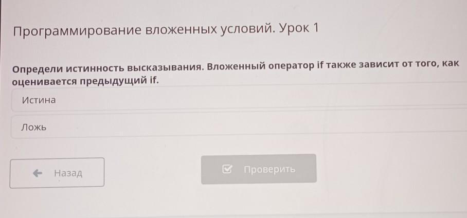 Программирование вложенных условий. Урок 1 Определи истинность высказывания. Вложенный оператор if также зависит от того, как оценивается предыдущий іf. Истина Ложь помогите пожалуйста даю 12 балов