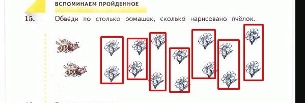 Решение:Пчёлок нарисовано две,мы обводим по две ромашки семь раз,так как пчёлок 14-ть.