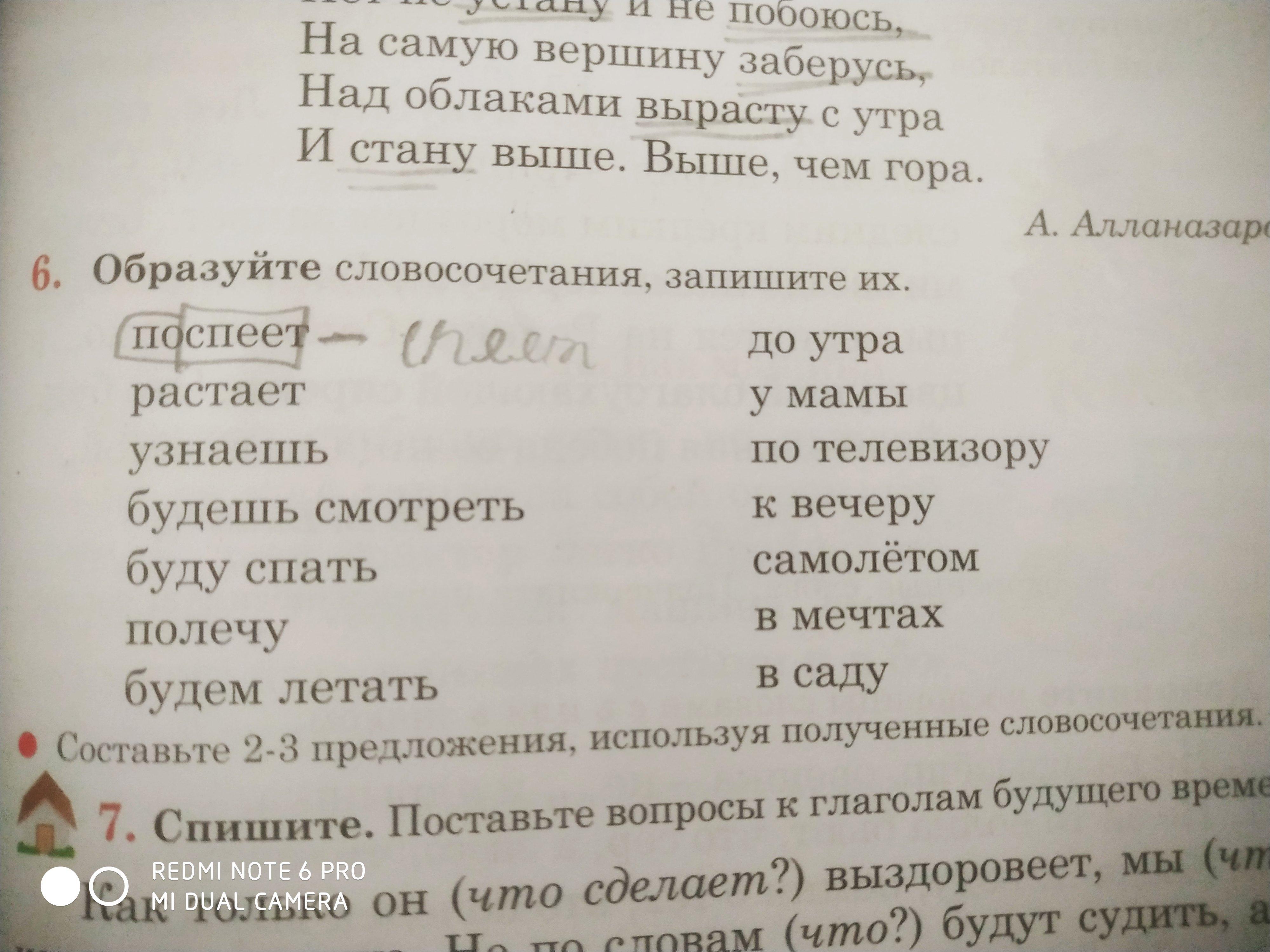 Поспеет в саду. Растает к вечеру. Узнаешь у мамы. Будешь смотреть по телевизору. Буду спать до утра. Полечу самолётом. Будем летать в мечтах.