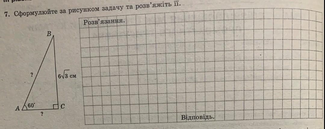 Задача . У прямокут. ΔАВС ∠С = 90° ; ∠А = 60° , а катет ВС = 6√3 см . Знайти гіпотенузу і катет АС тр - ника .