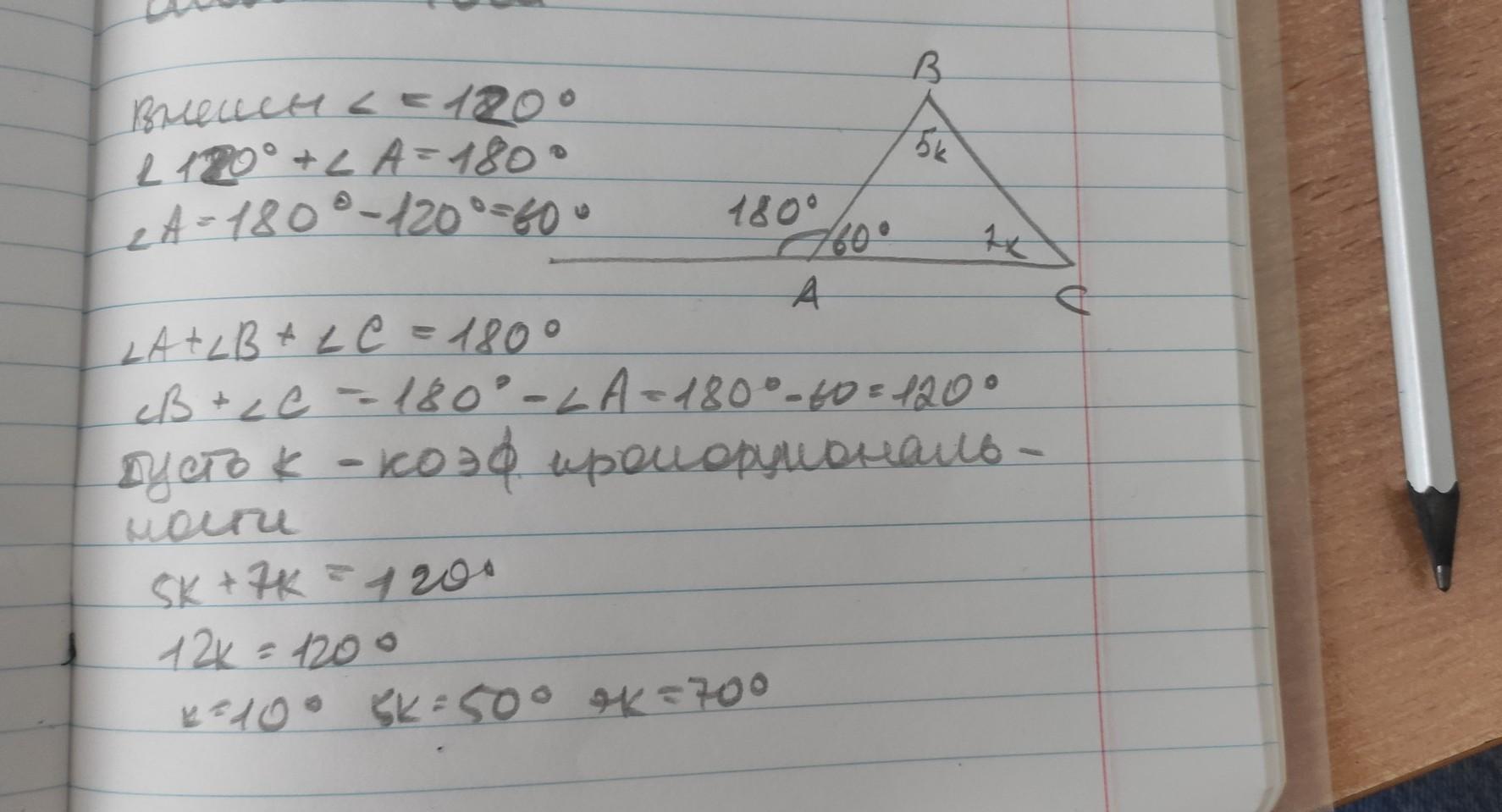 один із зовнішніх кутів трикутника дорівнює 180°.Знайдіть внутрішні кути,які з ними не суміжні якщо вони відносяться як 5:7