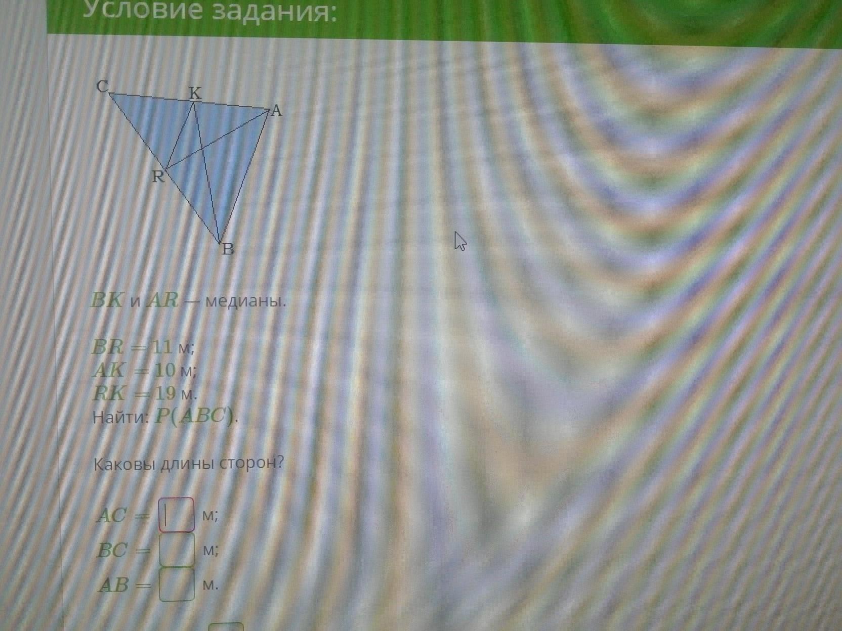 т.к. СR=RB=1/2CB и СК=КА=1/2СА, то RK- средняя линия и RK=1/2AB по свойству ср.линии, тогда АВ=2×19=38м