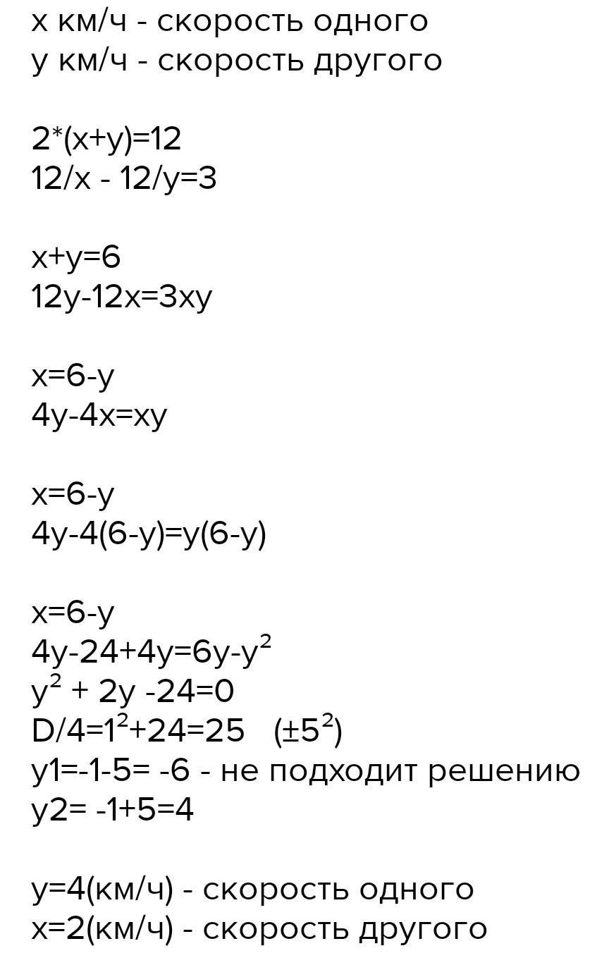 З двох пунктів, відстань між якими 12км, одночасно назустріч один одному вирушили два пішоходи і зустрілися через 2 год. Знайдіть швидкість кожного пішохода, якщо один з них витрачає на весь шлях 3 години більше ніж другий!!! пліз срочно! 50 балів.