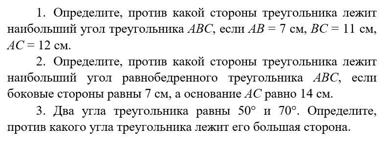 3)Третий уголбудет равен 180°-50°-70°=60°. Значит против угла70° будет лежать большая сторона