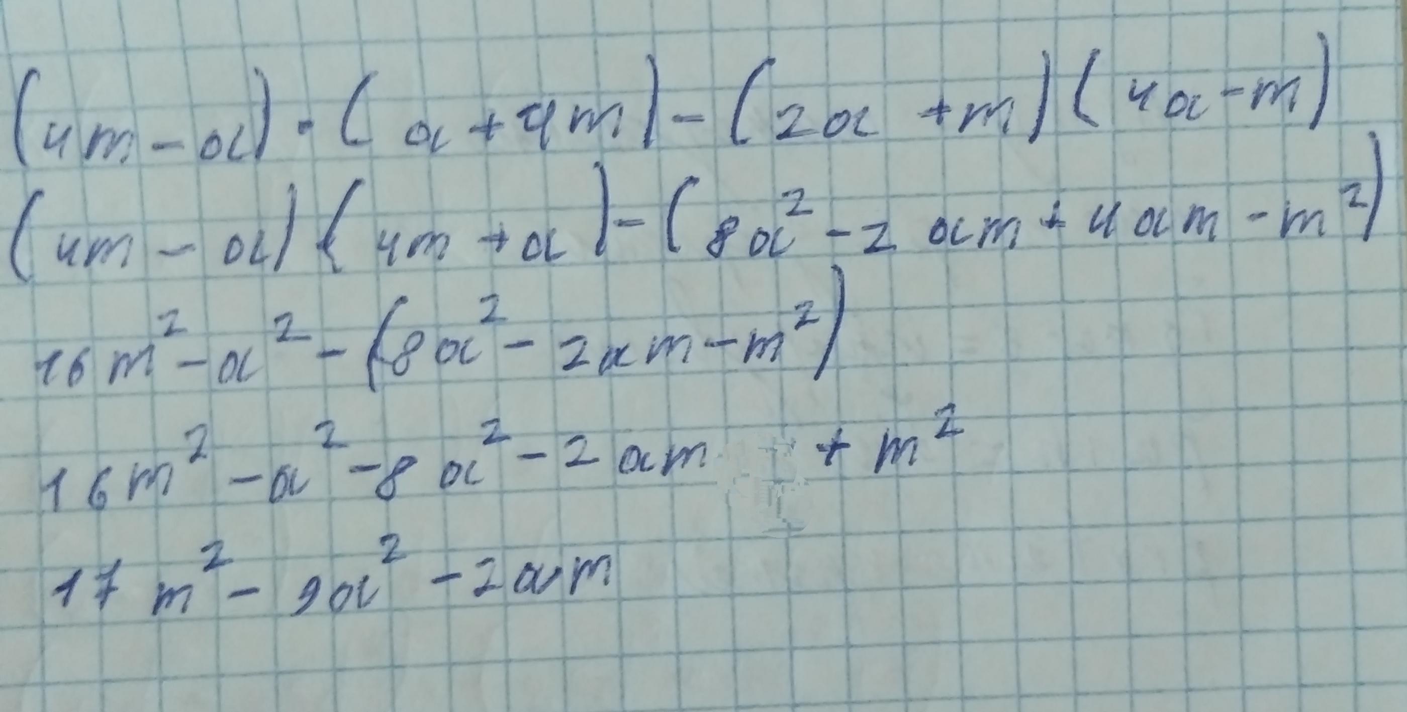 (4m-a)(a+4m) - (2a+m)(4a-m)= (4m-a)(a+4m)-(8a²-2am+4am-m²)=16m²-a²-(8a²+2am -m²)=16m² - a² - 8a² -2am +m²= 17m²-9a²-2am