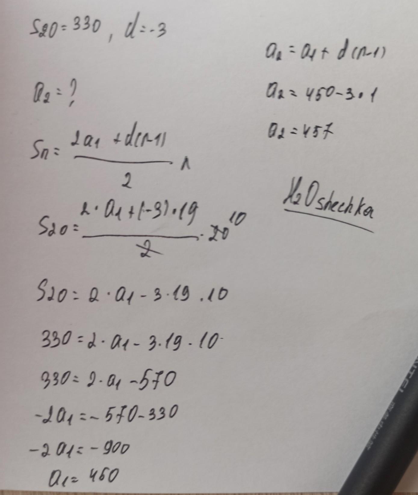 Здесь n=20, d=-3, Sn=330, значит найдём а1