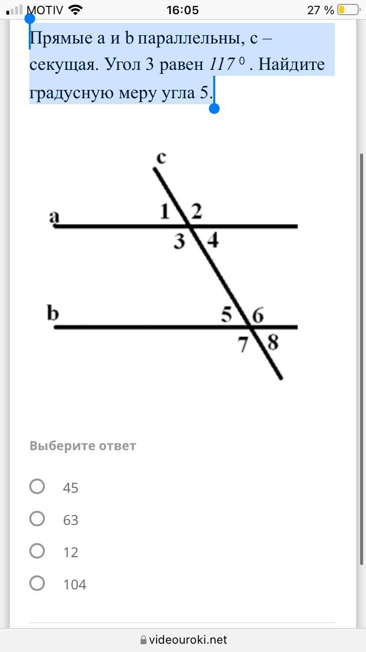 Прямые а и b параллельны, с – секущая. Угол 3 равен 117 градусов. Найдите градусную меру угла 5.