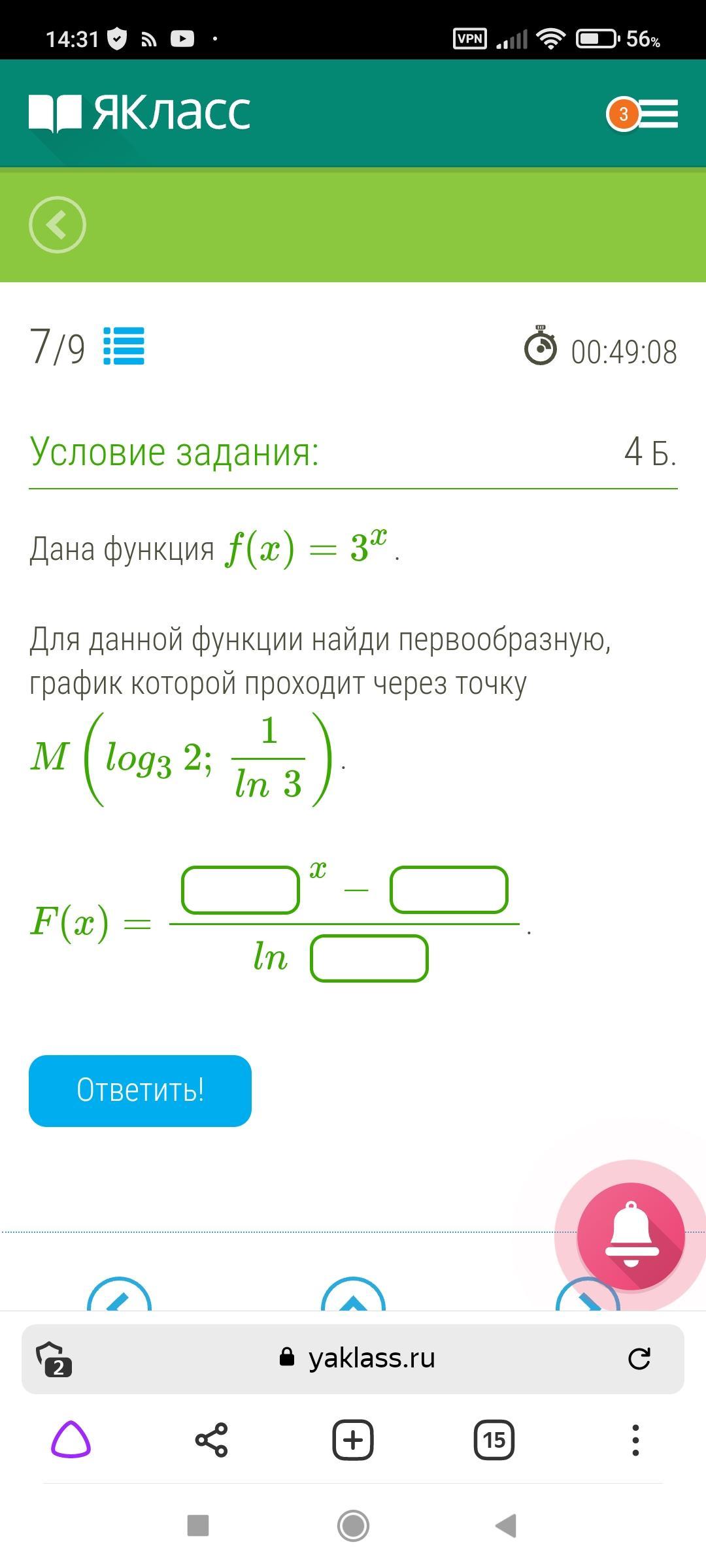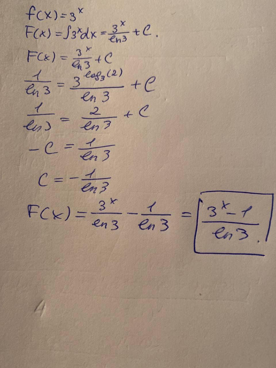 Для данной функции найди первообразную, график которой проходит через точку M(log32;1ln3).