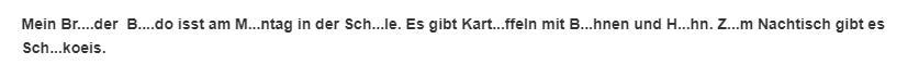 Mein Bruder Bodo isst am Montag in der Schule. Es gibt Kartoffeln mit Bohnen und Huhn. Zum Nachtish gibt es Schokoeis.