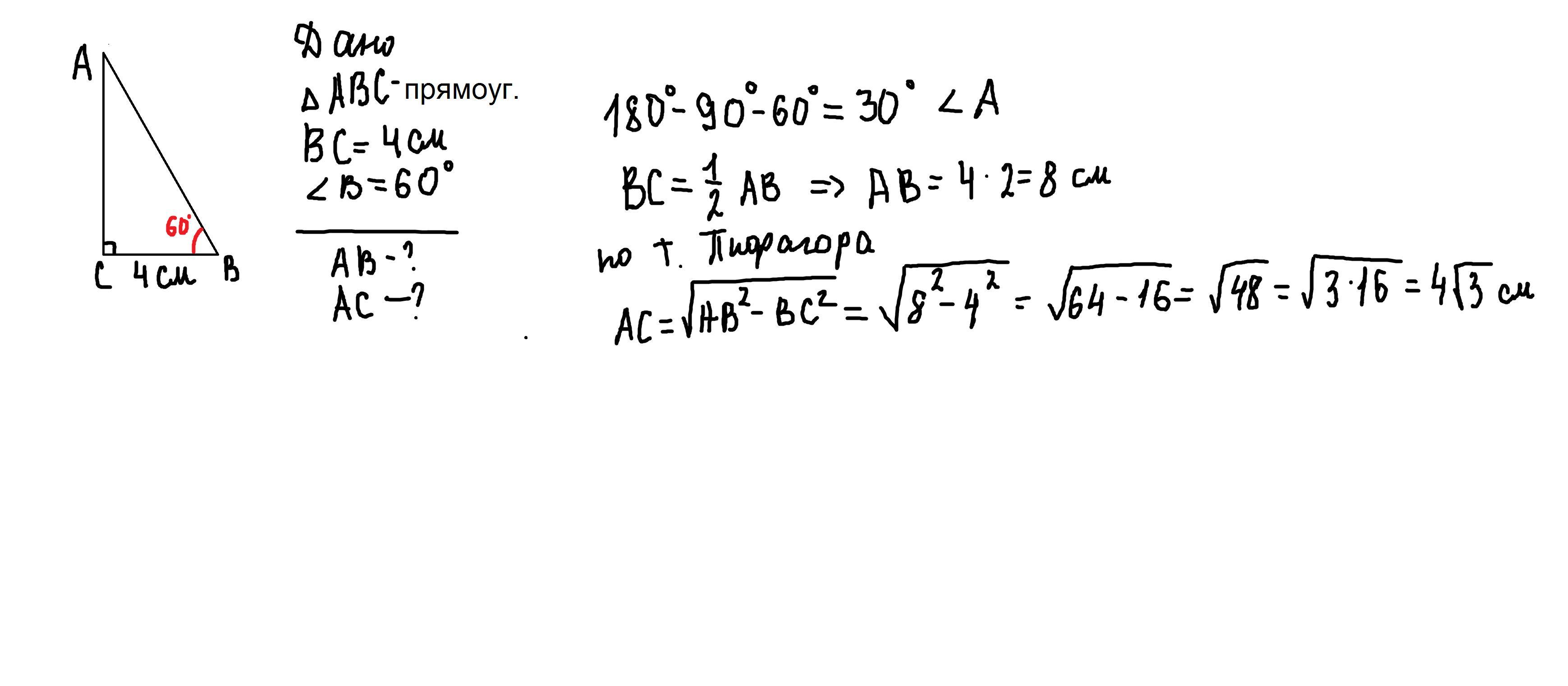 Знайдіть катет і гіпотенузу прямокутного трикутника за катетом 4 см і прилеглим кутом в 60°