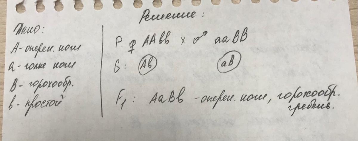 ЗАДАЧА 1. У певних порід курей оперення ніг і горохоподібний гребінь – домінантні ознаки, а голі ноги і простий гребінь – рецесивні ознаки. Який генотип і фенотип буде у курчат від схрещування гомозиготних курок з опереними ногами і простим гребенем і гомозиготних півнів, у яких голі ноги і горохоподібний гребінь? Ознаки не зчеплені зі статтю.