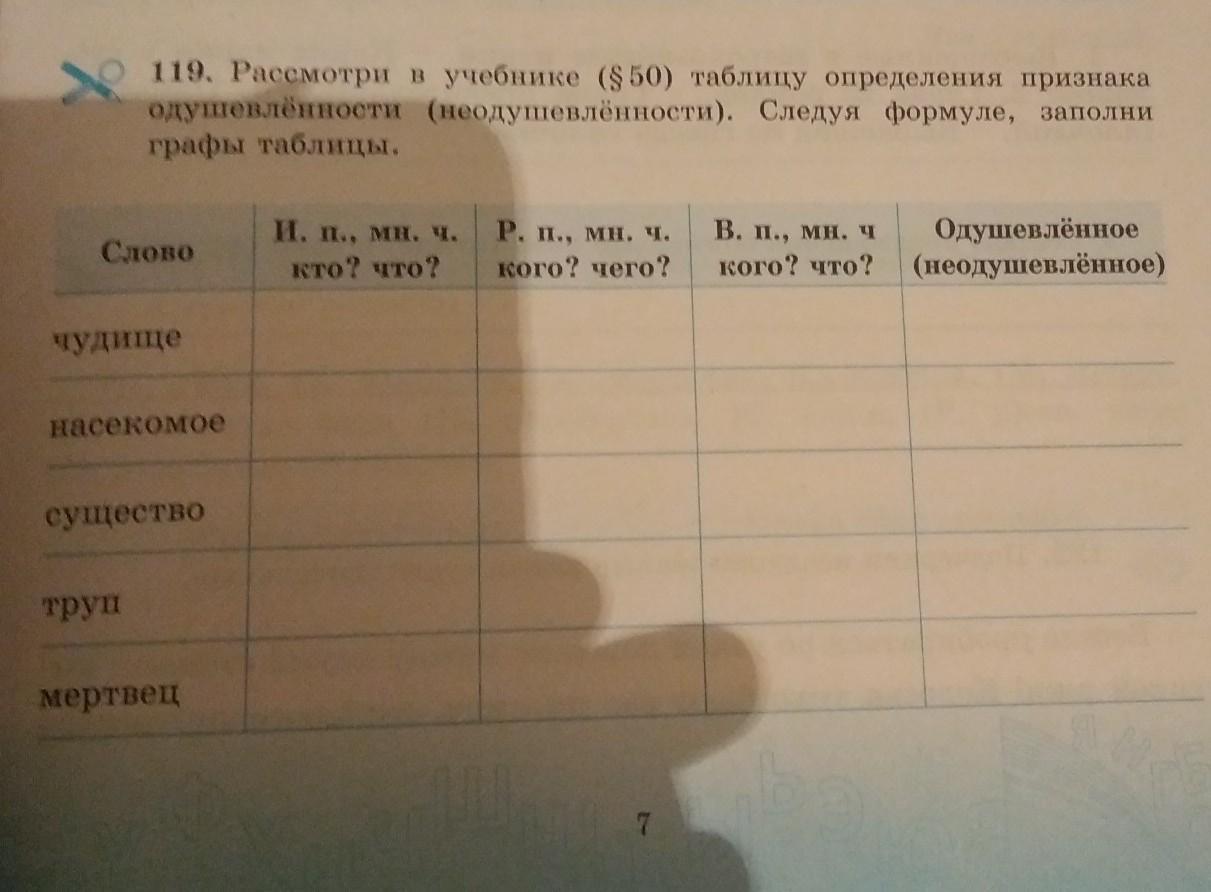 119. Рассмотри в учебнике (S 50) таблицу определения признака одушевлённости (неодушевлённости). Следуя формуле, заполни графы таблицы. Слово И. п., мн. ч. кто? что? Р. п., мн. ч. кого? чего? В. п., мн. ч кого? что? Одушевлённое (неодушевлённое) чудище насекомое существо труп мертвец