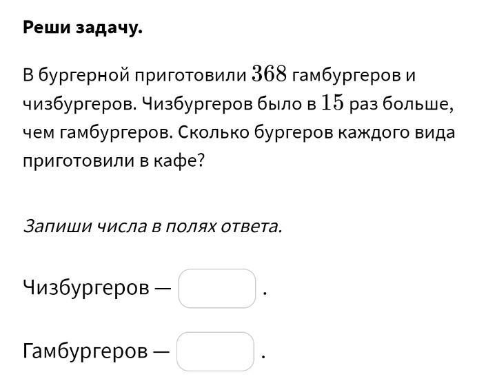 срочно!! бургерной приготовили 368 гамбургеров и чизбургеров. Чизбургеров было в 15 раз больше, чем гамбургеров. Сколько бургеров каждого вида приготовили в кафе?