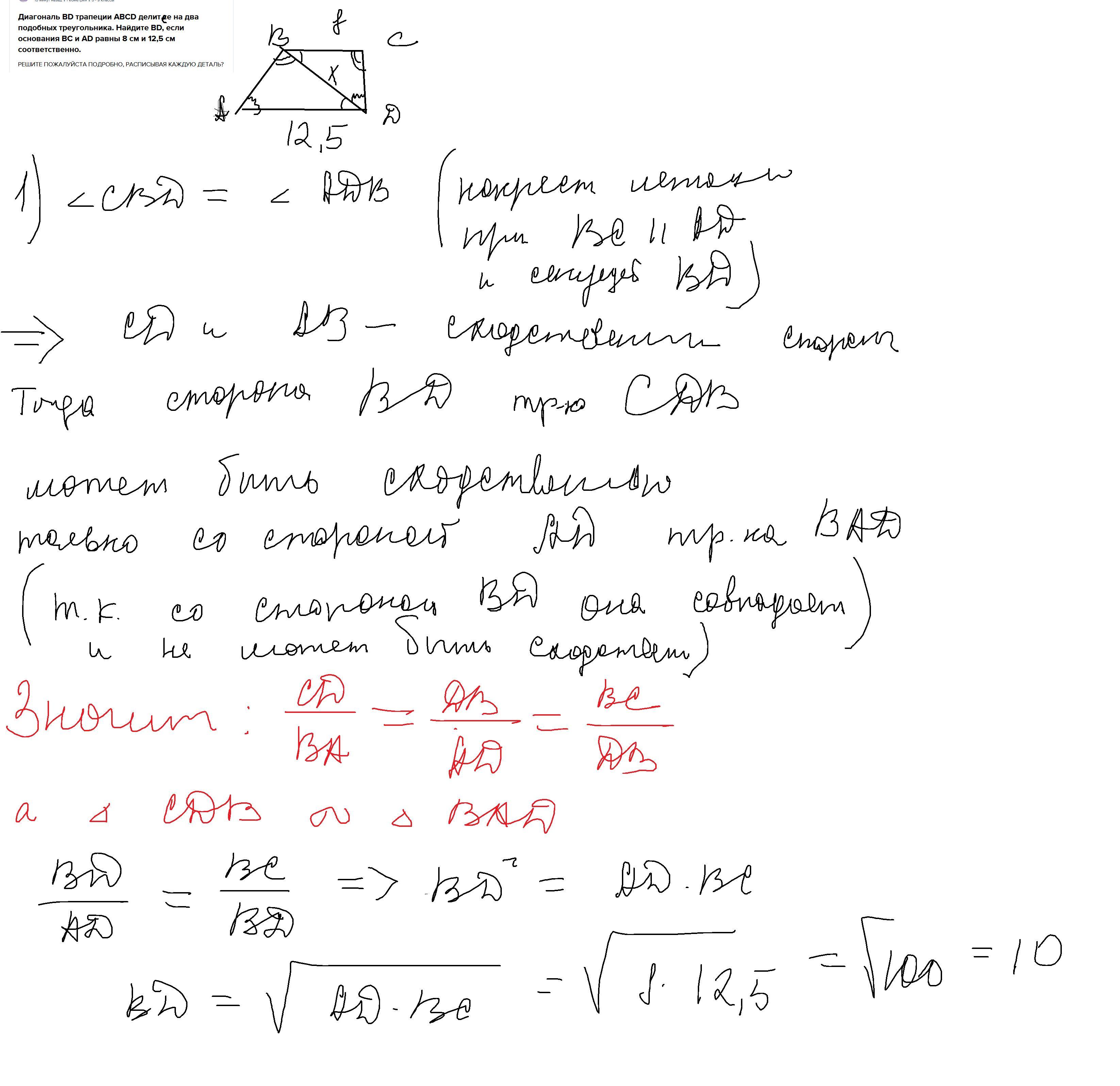 Диагональ BD трапеции ABCD делит се на два подобных треугольника. Найдите BD, если основания BС и AD равны 8 см и 12,5 см соответственно.