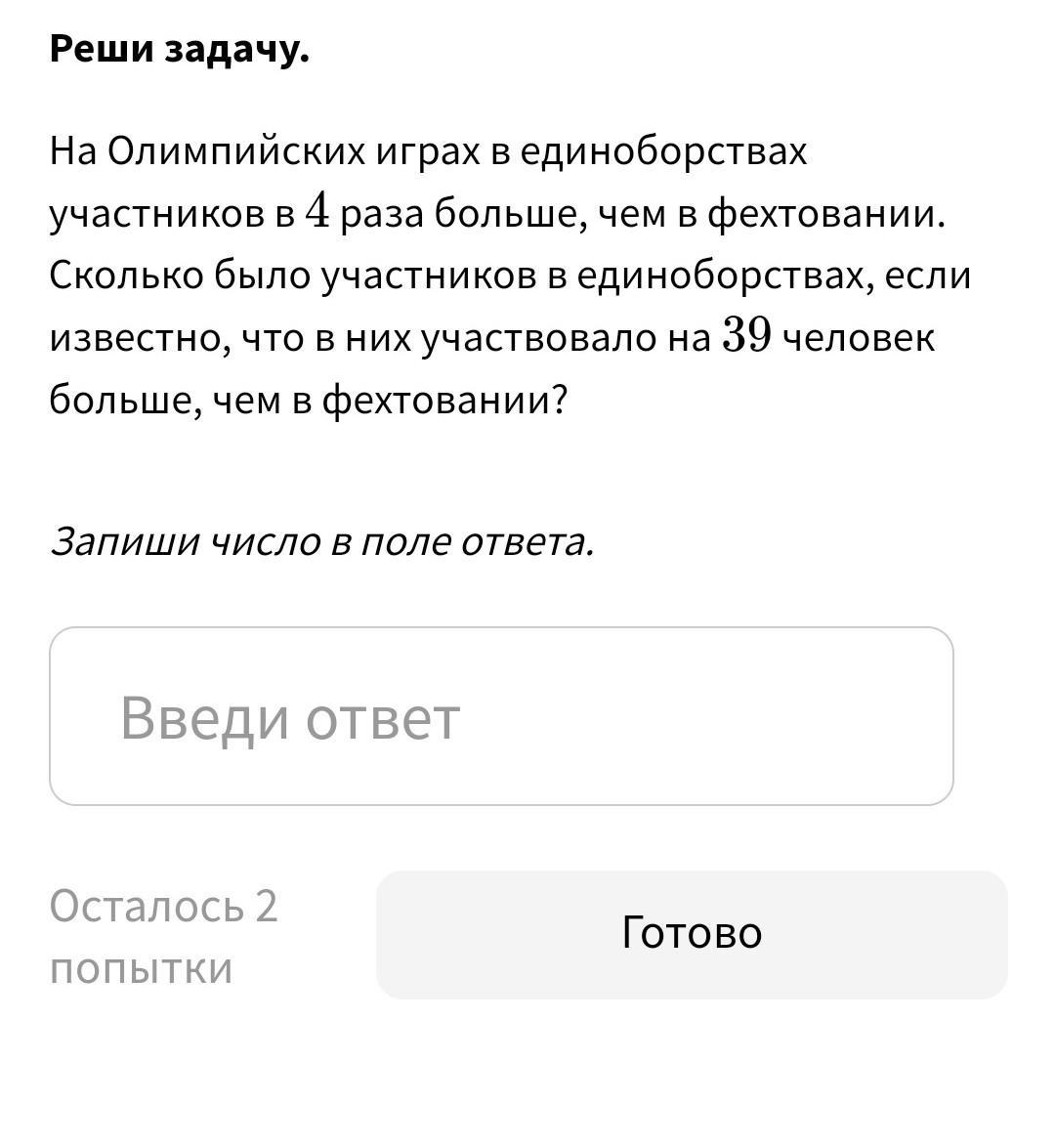 срочно На Олимпийских играх в единоборствах участников в 4 раза больше, чем в фехтовании. Сколько было участников в единоборствах, если известно, что в них участвовало на 339 человек больше, чем в фехтовании?