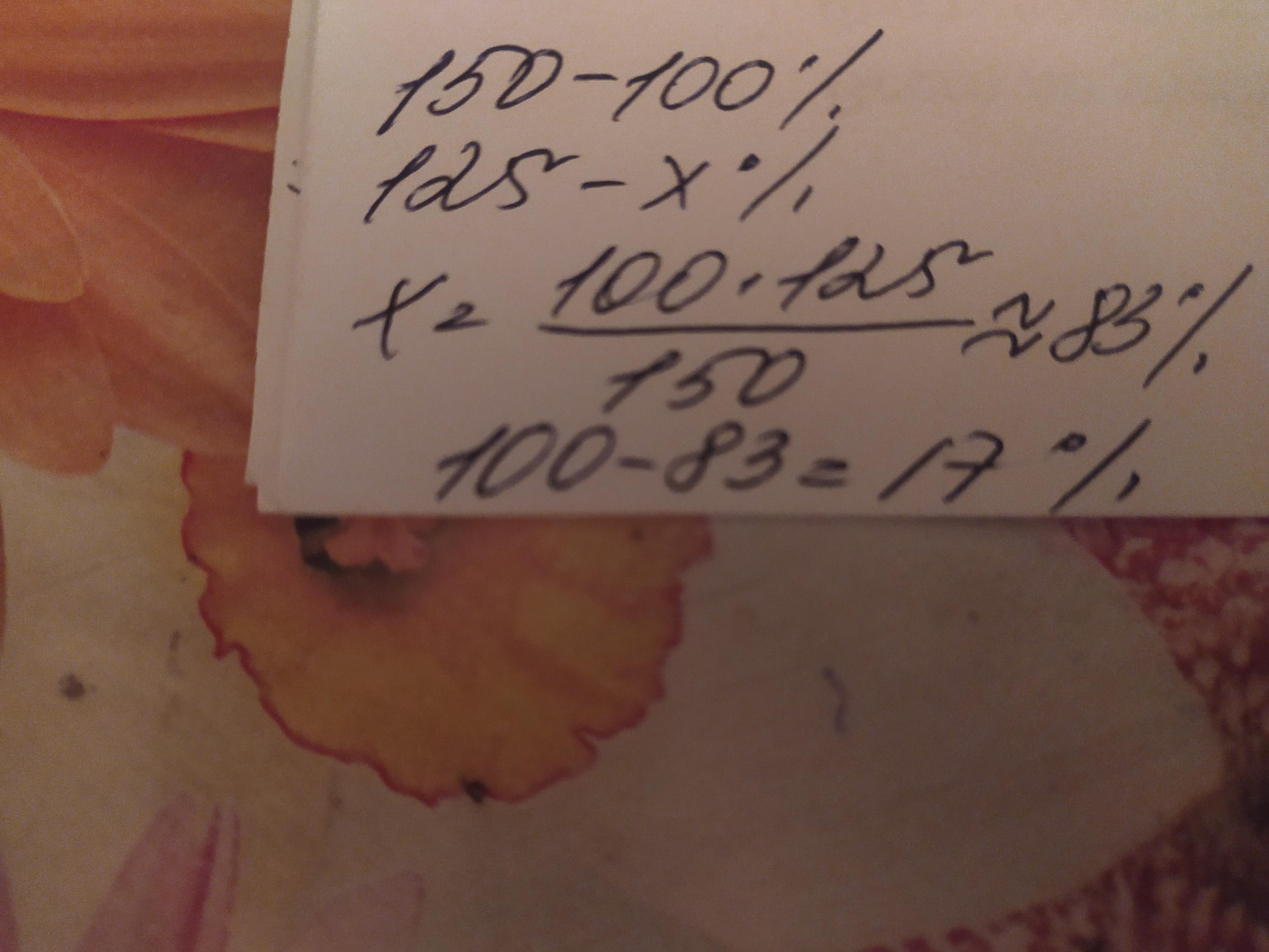 Цена шкафа снизилась з 150 грн.до 125 грн.На сколько вiдсотков снизилась цена шкафа?