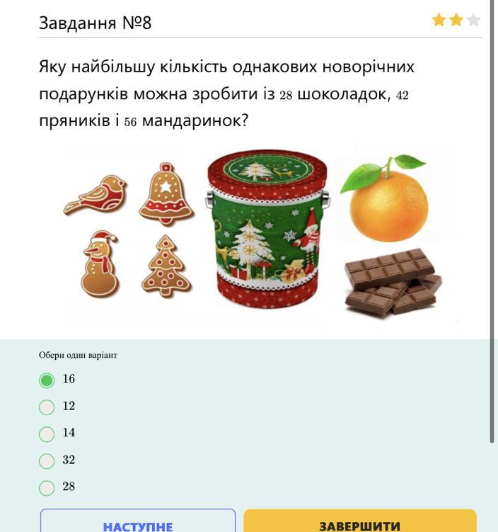 шоколадок 2, пряников 3, мандаринок 4. С 32, 28, 16, подарками нельзя придумать, а с 14 можно