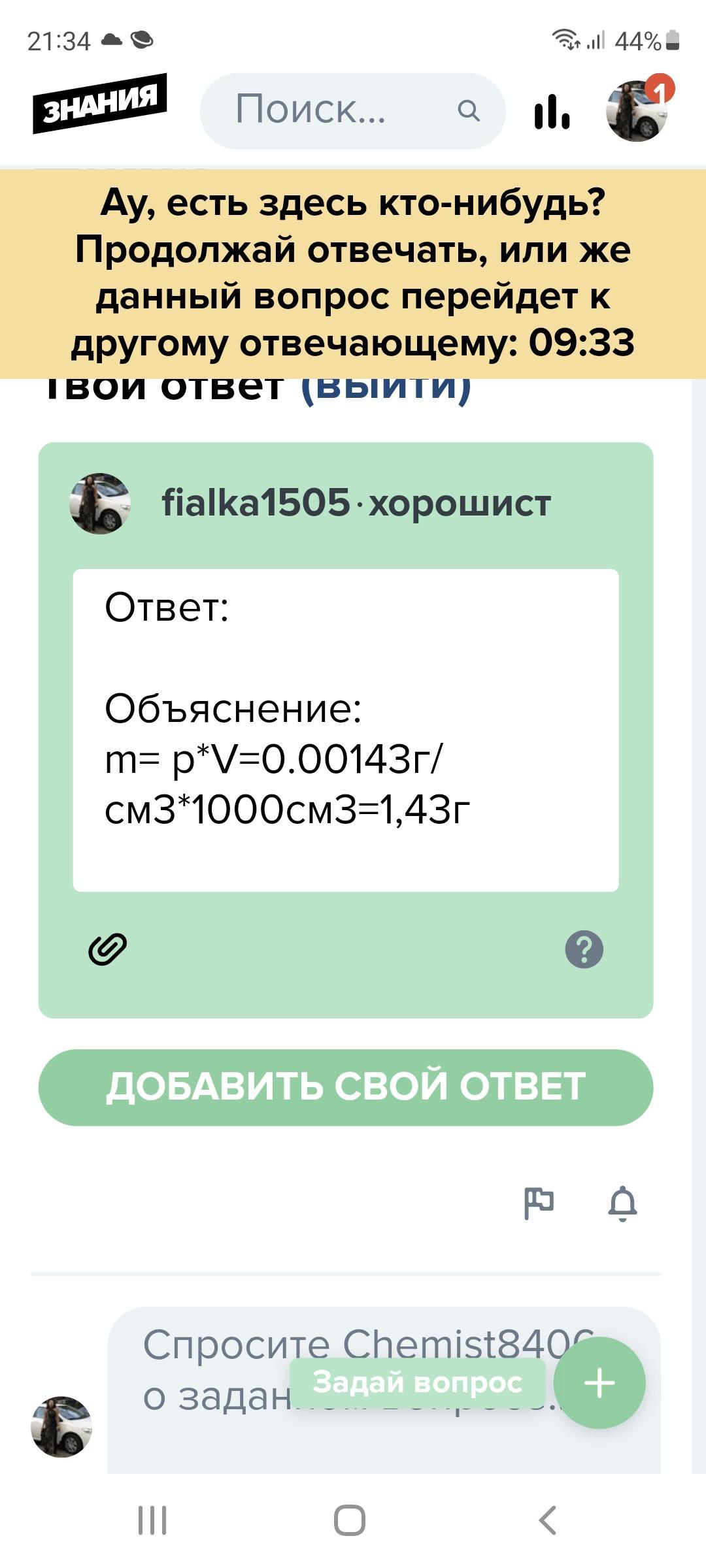 m= p*V=0.00143г/см3*1000см3=1,43г