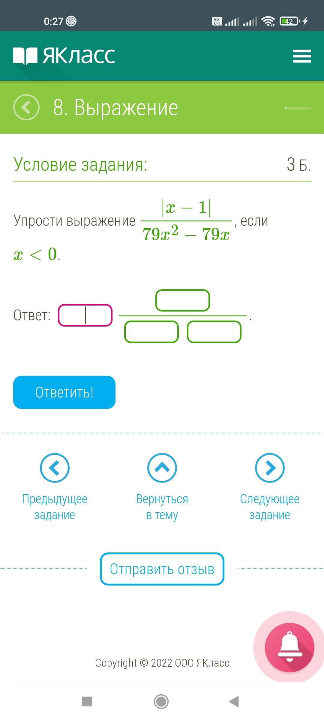 \displaystyle\bf\\x<0\\\\\\\frac{|x-1|}{79x^{2} -79x} =\frac{1-x}{79x(x-1)} =-\frac{1}{79x} \\\\\\Otvet:-\frac{1}{79x}