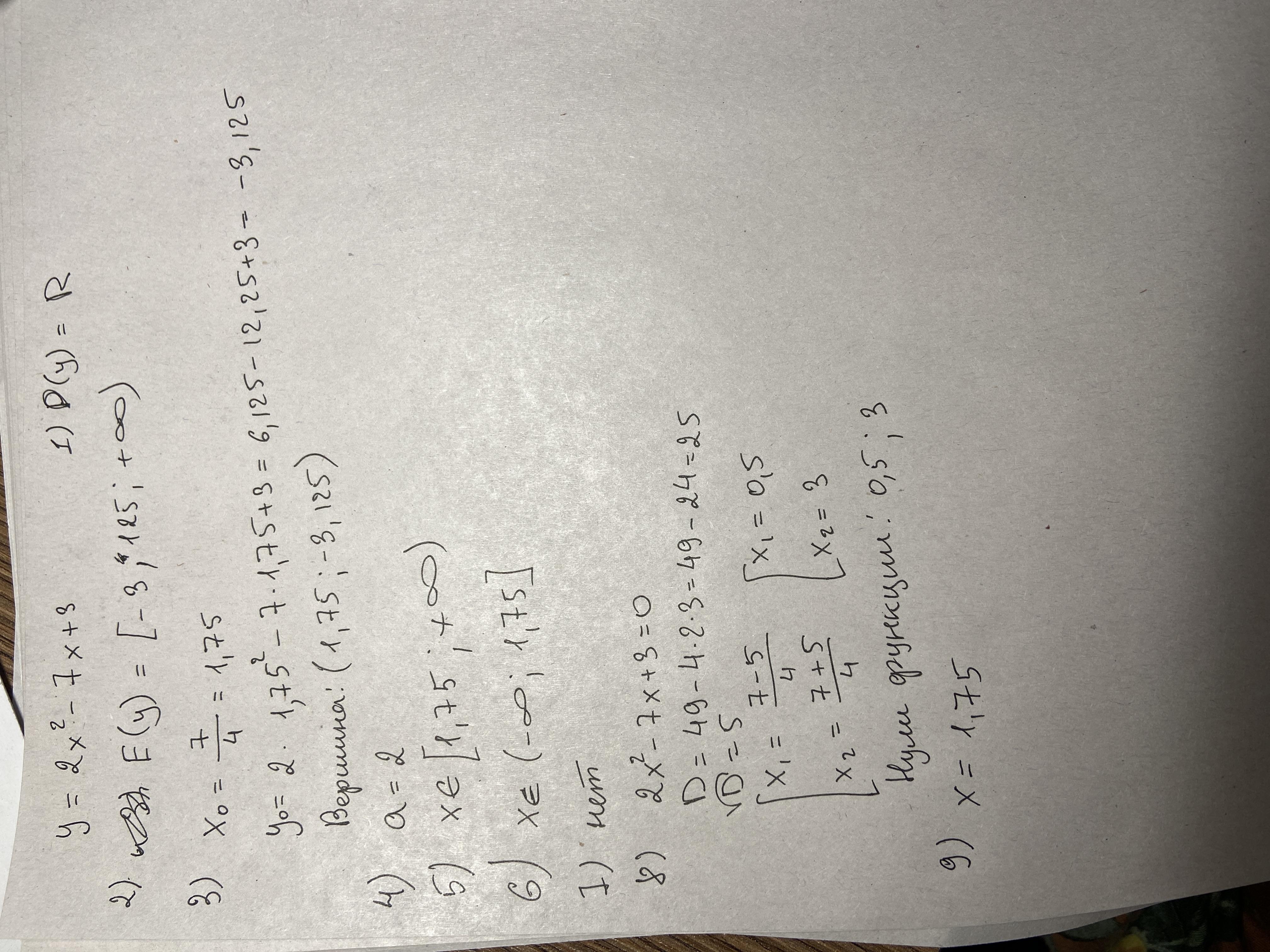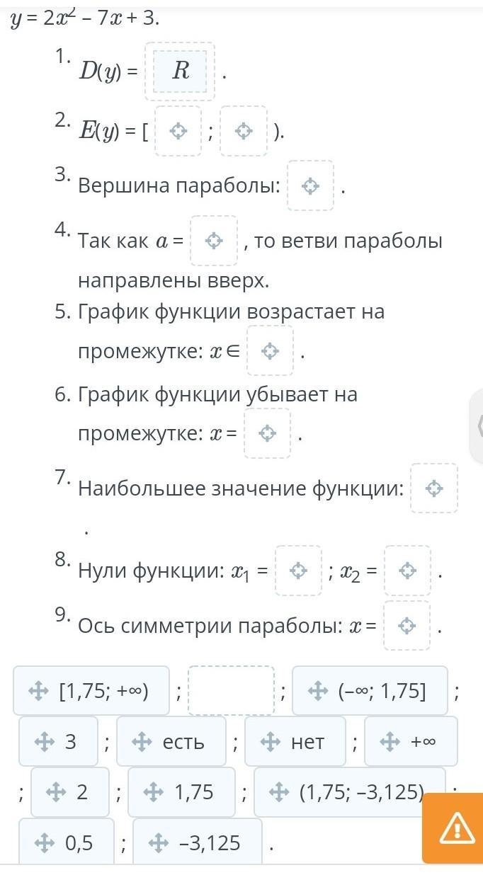 Опиши свойства квадратичной функции y = 2x2 – 7x + 3. D(y) = . E(y) = [ ; ). Вершина параболы: . Так как a = , то ветви параболы направлены вверх. График функции возрастает на промежутке: x ∈ . График функции убывает на промежутке: x = . Наибольшее значение функции: . Нули функции: x1 = ; x2 = . Ось симметрии параболы: x =